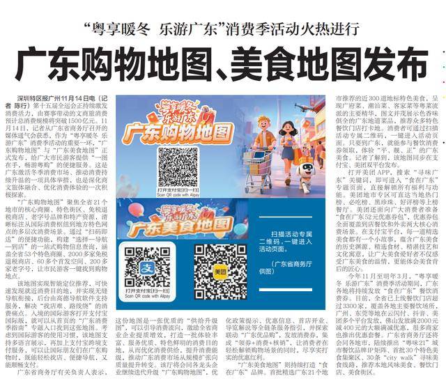 第十五届全运会正持续激发消费活力,由赛事带动的文商旅消费预计总消费规模将突破1500亿元。11月14日,记者从广东省商务厅召开的媒体通气会获悉,作为“粤享暖冬 乐游广东”消费季活动的重要一环,“广东购物地图”与“广东美食地图”正式发布,给广大市民游客提供“一图在手,畅游粤购”的便捷服务。这是广东激活冬季消费市场、推动消费持续升温的一项具体举措,也是深化商文旅体融合、优化消费体验的一次积极探索。