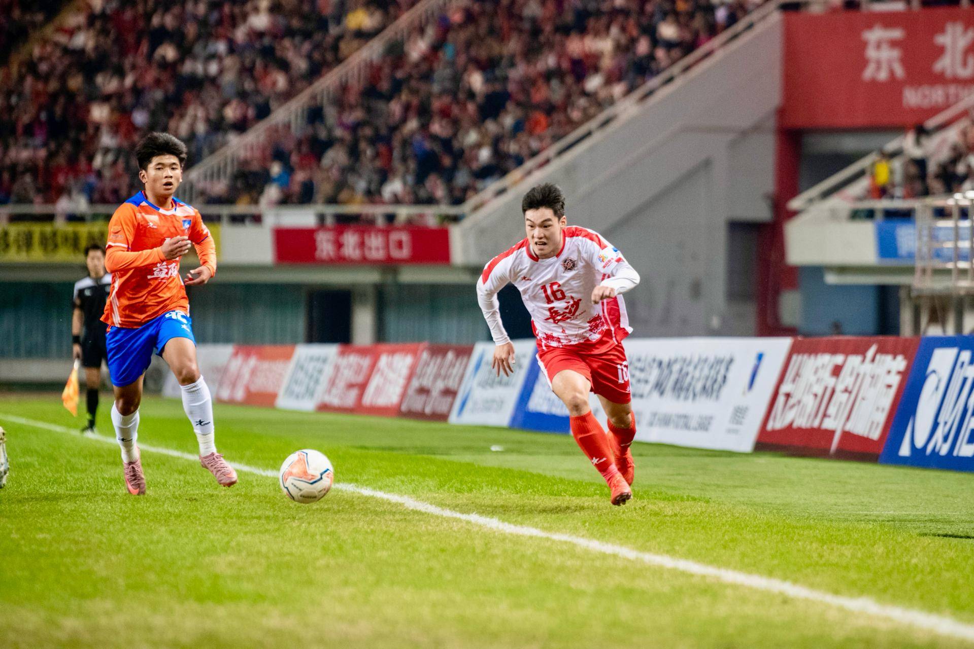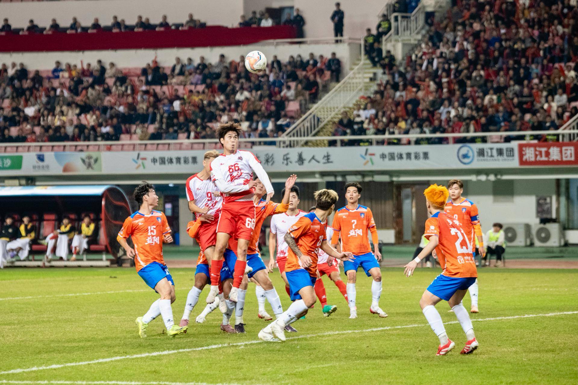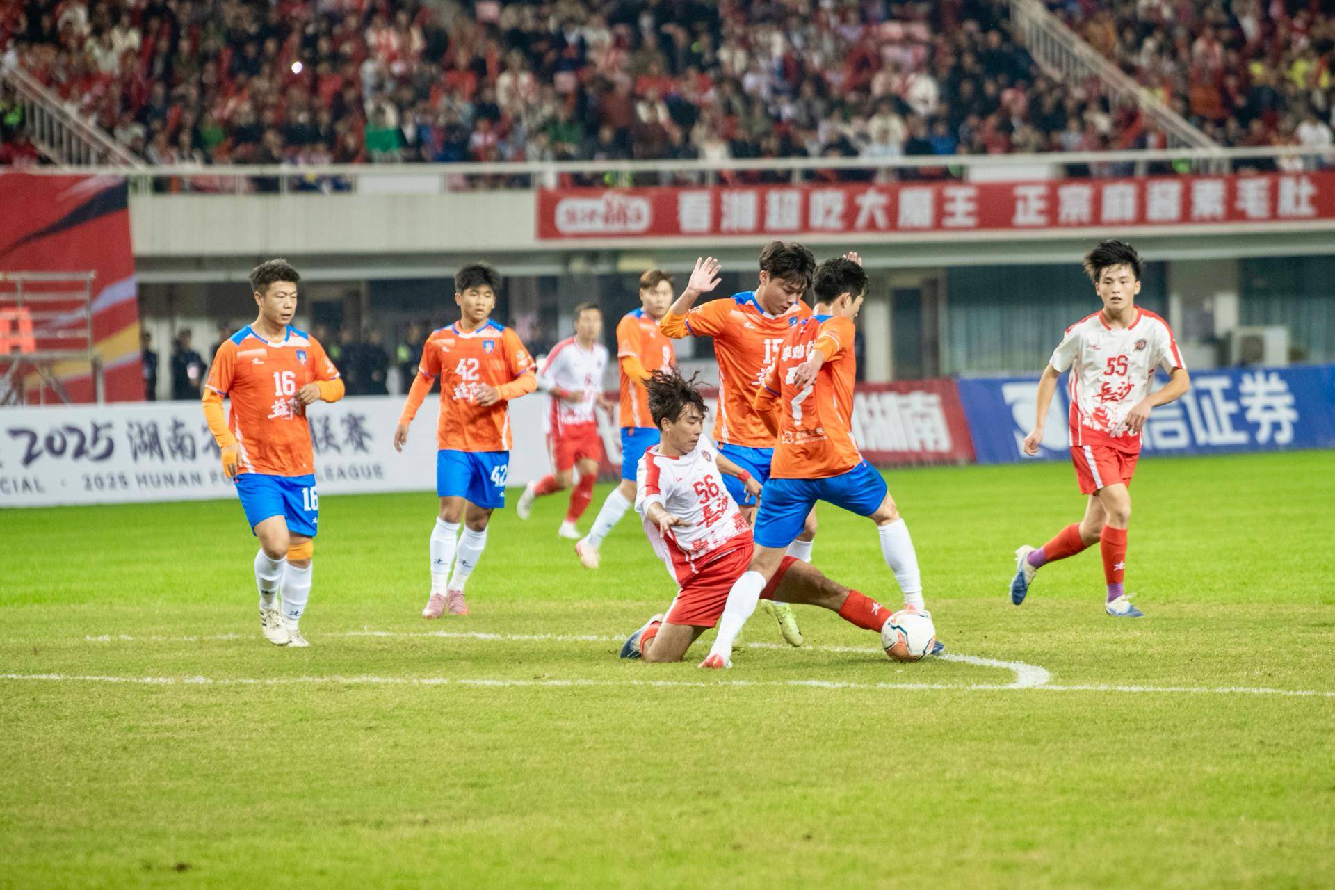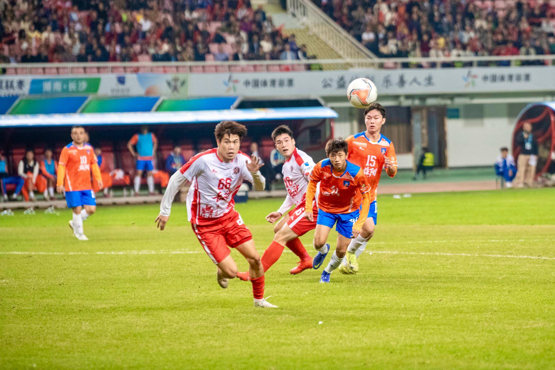 11月14日晚,2025年湖南省足球联赛(简称“湘超”联赛)在长沙贺龙体育场进行了第十轮的一场比赛。当晚,长沙队(红白色)与客队益阳队(橘色)上演激情对攻战。经过90激烈角逐,最终长沙队以3:0的比分战胜了益阳队,继续领跑积分榜。