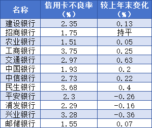 兴业银行、平安银行、浦发银行信用卡不良率发生好转,分别较上年末下降0.36个百分点、0.26个百分点、0.16个百分点。