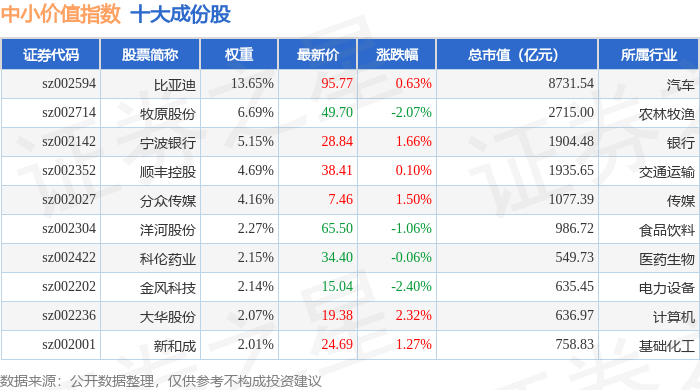中小价值(399604)指数十大成份股详情如下: