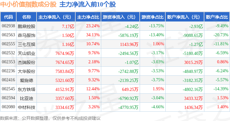 资金流向方面,中小价值(399604)指数成份股当日主力资金净流入合计5.23亿元,游资资金净流出合计2.69亿元,散户资金净流出合计2.54亿元。成份股资金流向详情见下表: