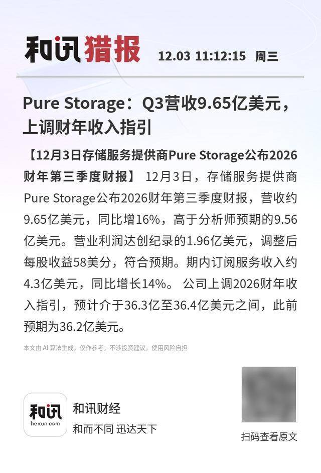 【12月3日存储服务提供商Pure Storage公布2026财年第三季度财报】12月3日,存储服务提供商Pure Storage公布2026财年第三季度财报,营收约9.65亿美元,同比增16%,高于分析师预期的9.56亿美元。营业利润达创纪录的1.96亿美元,调整后每股收益58美分,符合预期。期内订阅服务收入约4.3亿美元,同比增长14%。 公司上调2026财年收入指引,预计介于36.3亿至36.4亿美元之间,此前预期为36.2亿美元。