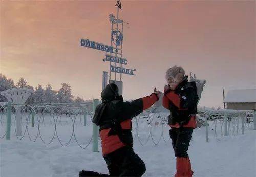 在奥伊米亚康零下71.2摄氏度纪念碑前,