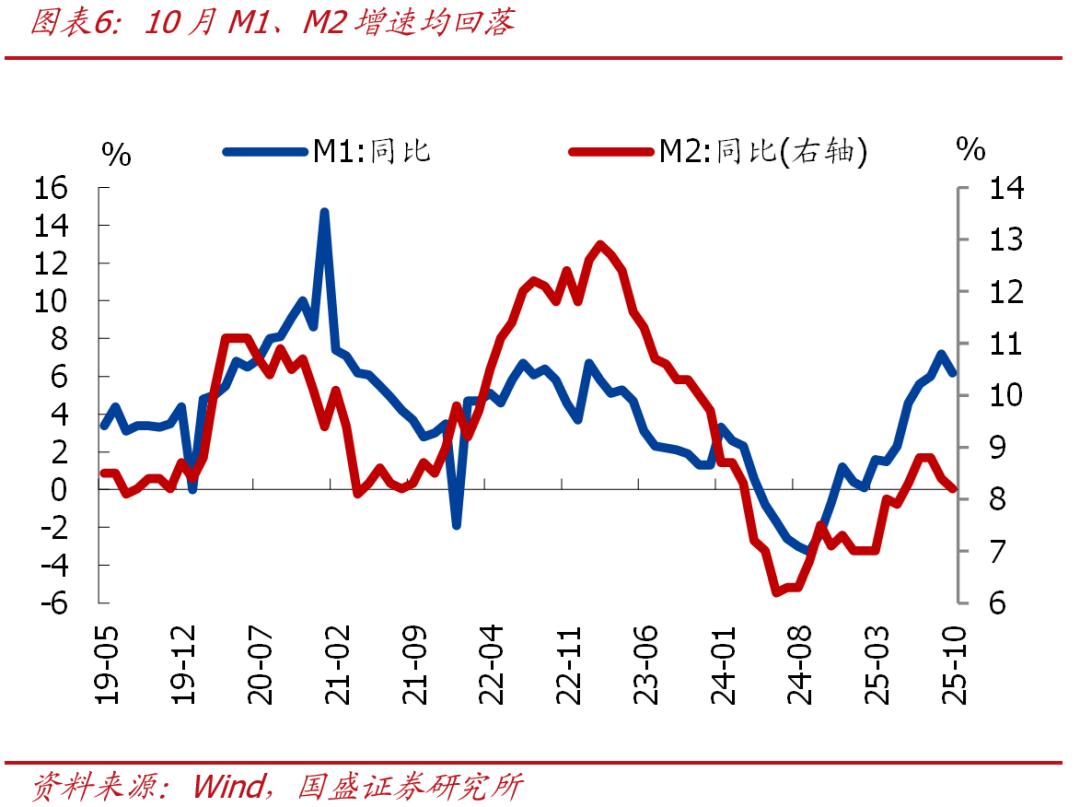 >10月M1同比6.2%,较上月回落1个百分点,一方面基数有所走高,另一方面与居民存款逐步转移至非银存款、活期存款减少有关。M2同比8.2%,较上月回落0.2个百分点,除基数走高外,信用扩张放缓仍是主要拖累。存款方面,10月存款增加6100亿,同比多增100亿,非银存款同比多增7700亿,主要与居民存款搬家有关。财政存款方面,剔除政府债券后,财政存款增加2307亿,同比多增6850亿,指向支出边际放缓。