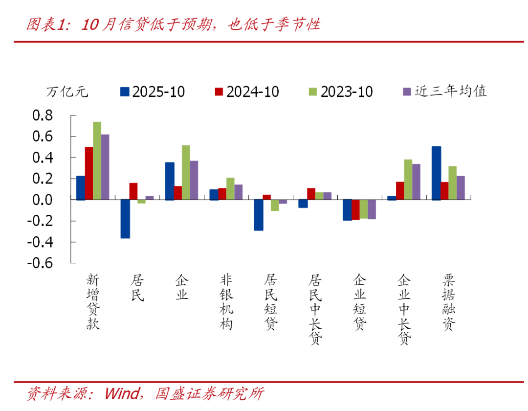 核心观点:10月新增信贷、社融规模均低于预期,也低于季节性。结构上,居民部门再度转为“去杠杆”,短贷、中长期贷款同比均少增;企业部门信贷同比转为多增,但票据冲量是主要贡献,政策性金融工具对企业信用扩张拉动效果暂未显现;政府债券对社融拖累明显,后续地方政府债券结存限额盘活后,可能有所好转。整体看,需求不足的问题仍然突出。往后看,维持我们年度策略报告(《乘势而上—2026年经济与资产展望》)的观点:货币宽松还是大方向,降准降息可期、节奏上“相机抉择”(我们预计2026年一季度之前大概率会降,旨在扭转经济下行态势、配合“十五五”抢开局),紧盯基本面的变化。