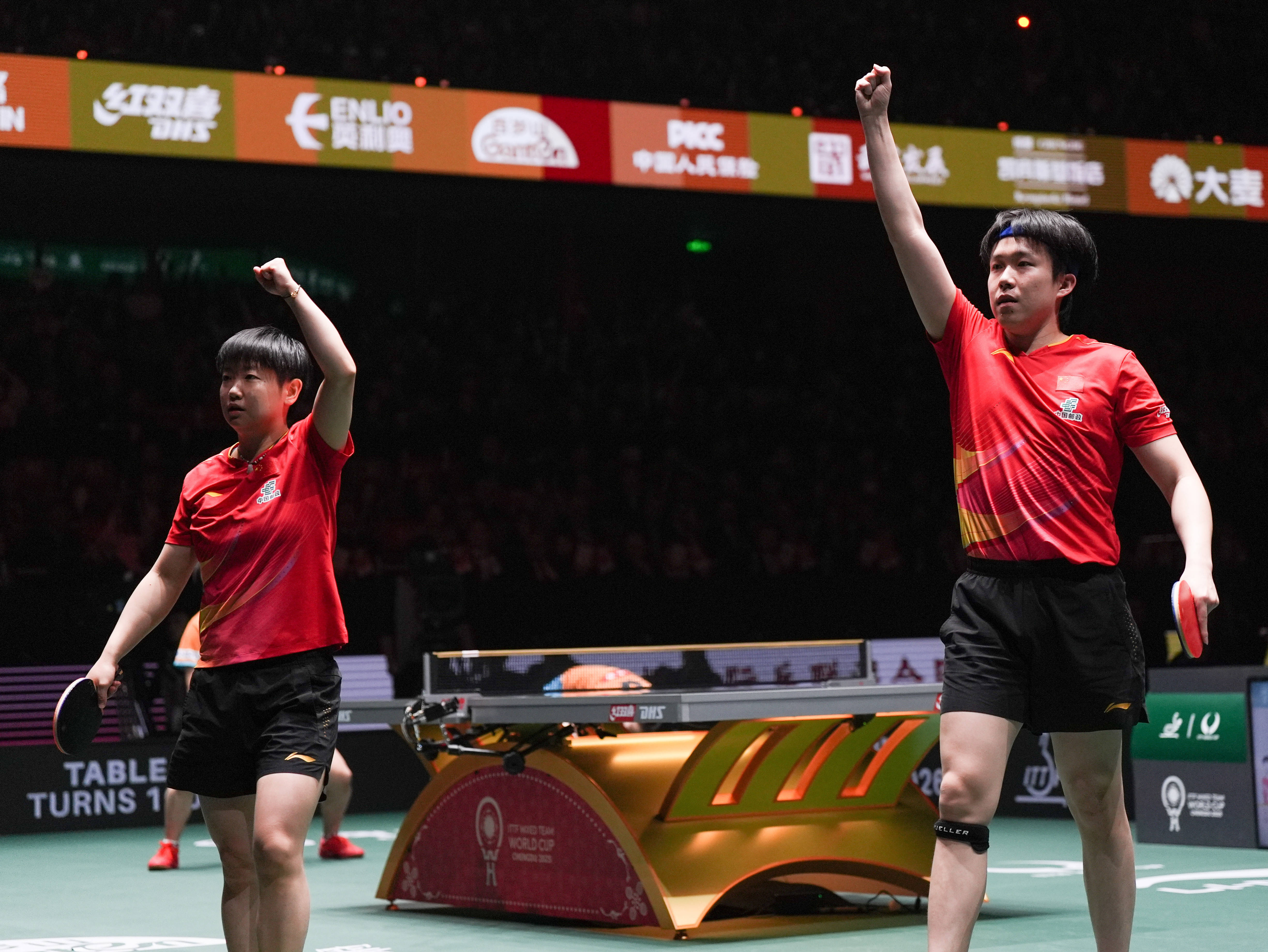 12月7日,中国队组合王楚钦(左)/孙颖莎在混双比赛中。他们3比0战胜日本队组合松岛辉空/大藤沙月。 新华社记者 王曦 摄