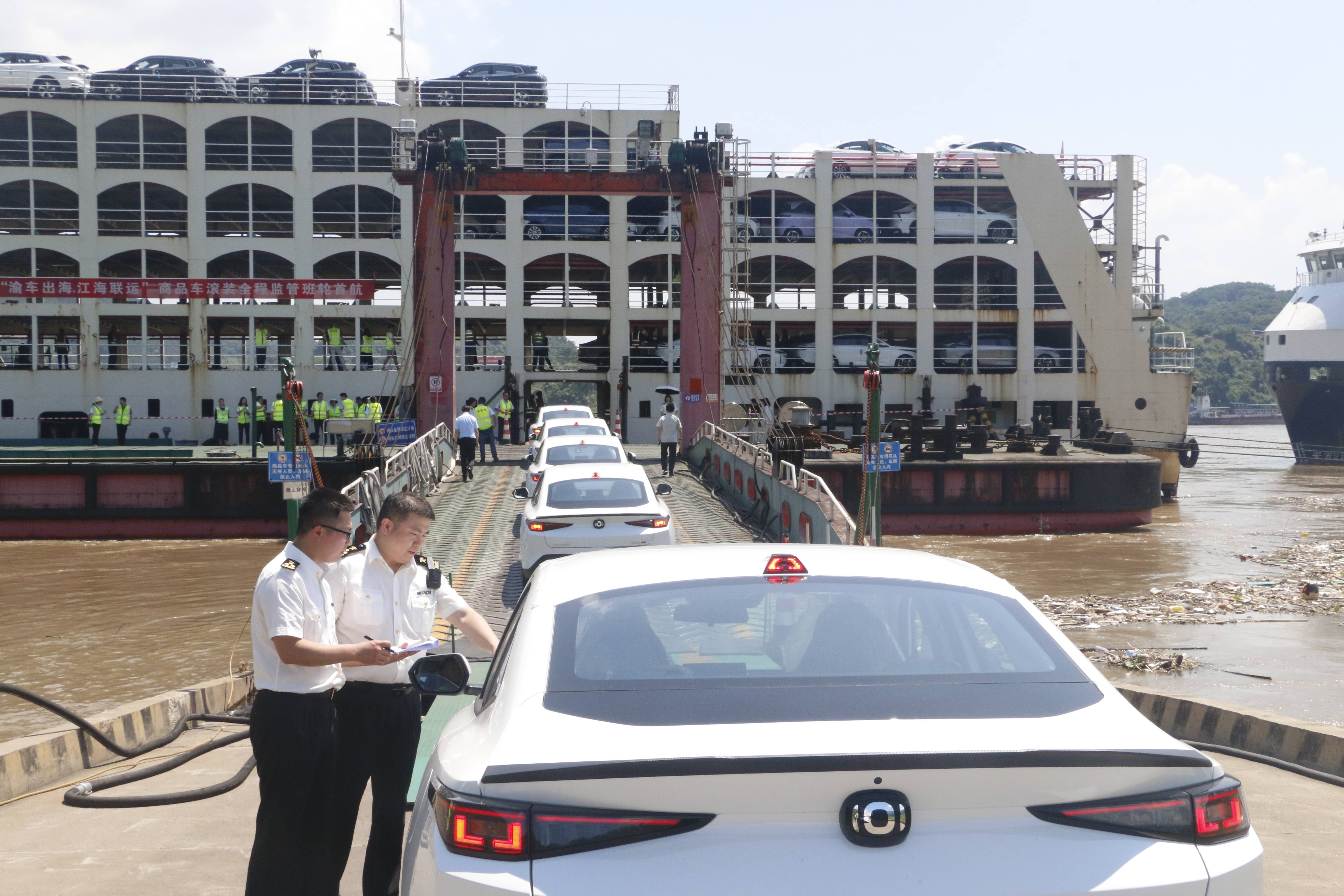6月27日,在重庆果园港滚装码头,重庆海关所属重庆港海关关员在监管出口整车。 新华社发(罗智文 摄)