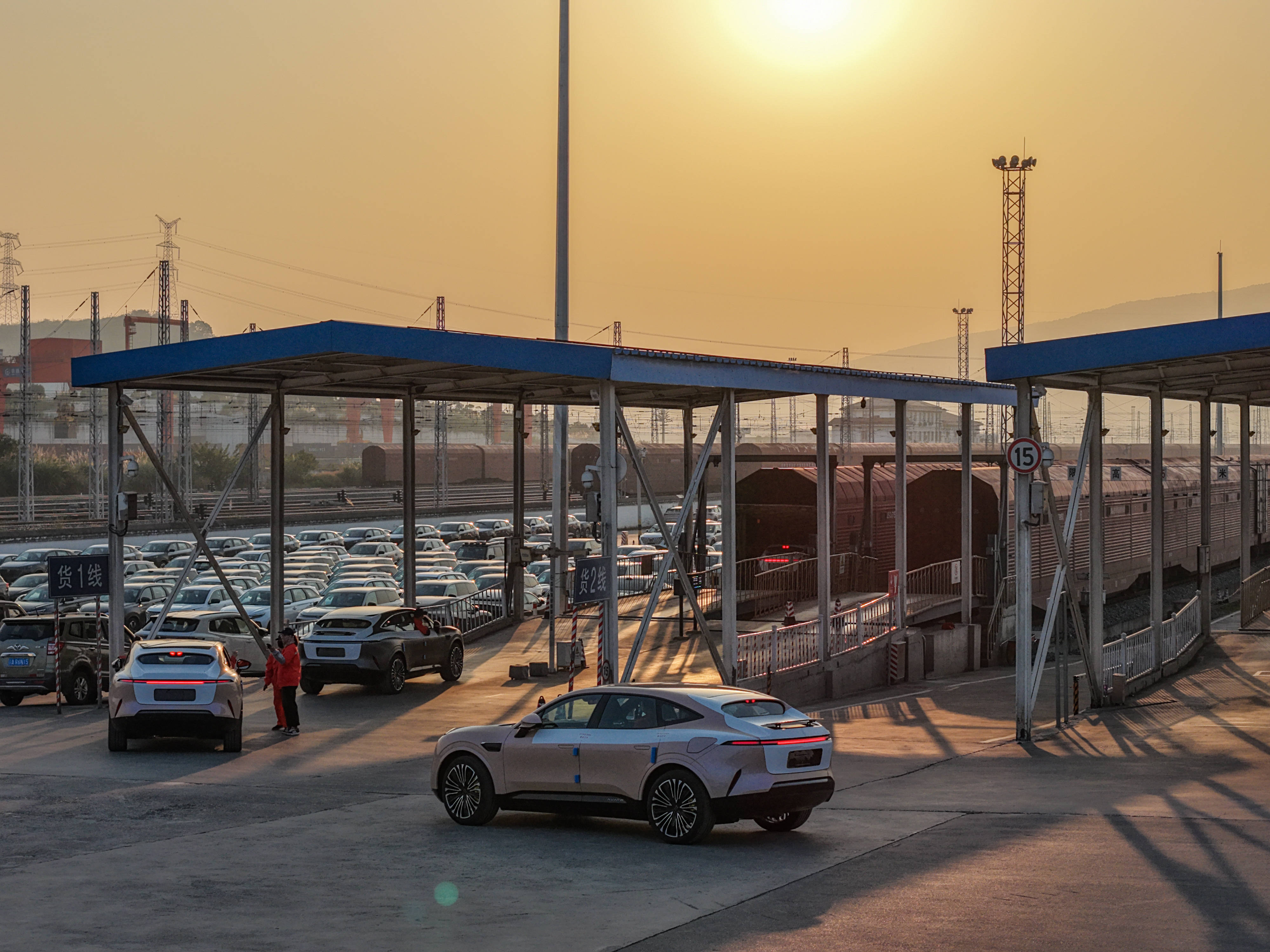 11月29日,在重庆果园港国家物流枢纽铁路货运鱼嘴站商品车物流基地,“重庆造”新能源汽车排队驶入“渝车”专列。 新华社记者 黄伟 摄