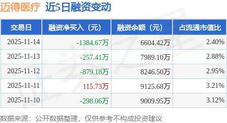 证券之星消息,11月14日,迈得医疗(688310)融资买入1013.0万元,融资偿还2397.67万元,融资净卖出1384.67万元,融资余额6604.42万元,近20个交易日中有11个交易日出现融资净买入。