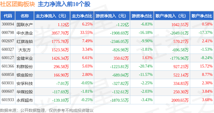 从资金流向上来看,当日社区团购板块主力资金净流出2.54亿元,游资资金净流出1.4亿元,散户资金净流入3.94亿元。社区团购板块个股资金流向见下表: