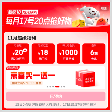 京东超级18活动时间是从每月17日开始至18日结束,在2025年11月京东超级18活动是从2025年11月17日20:00开始至11月18日23:59结束,在活动时间 内可享受超级福利(包含但不限)满减券每满200减20、随机红包18元无门槛、Plus会员千元券、白条6期免息、京喜买一送一、18元购多件、部分商品真5折等活动福利如有变更,请以官方实际活动为准。