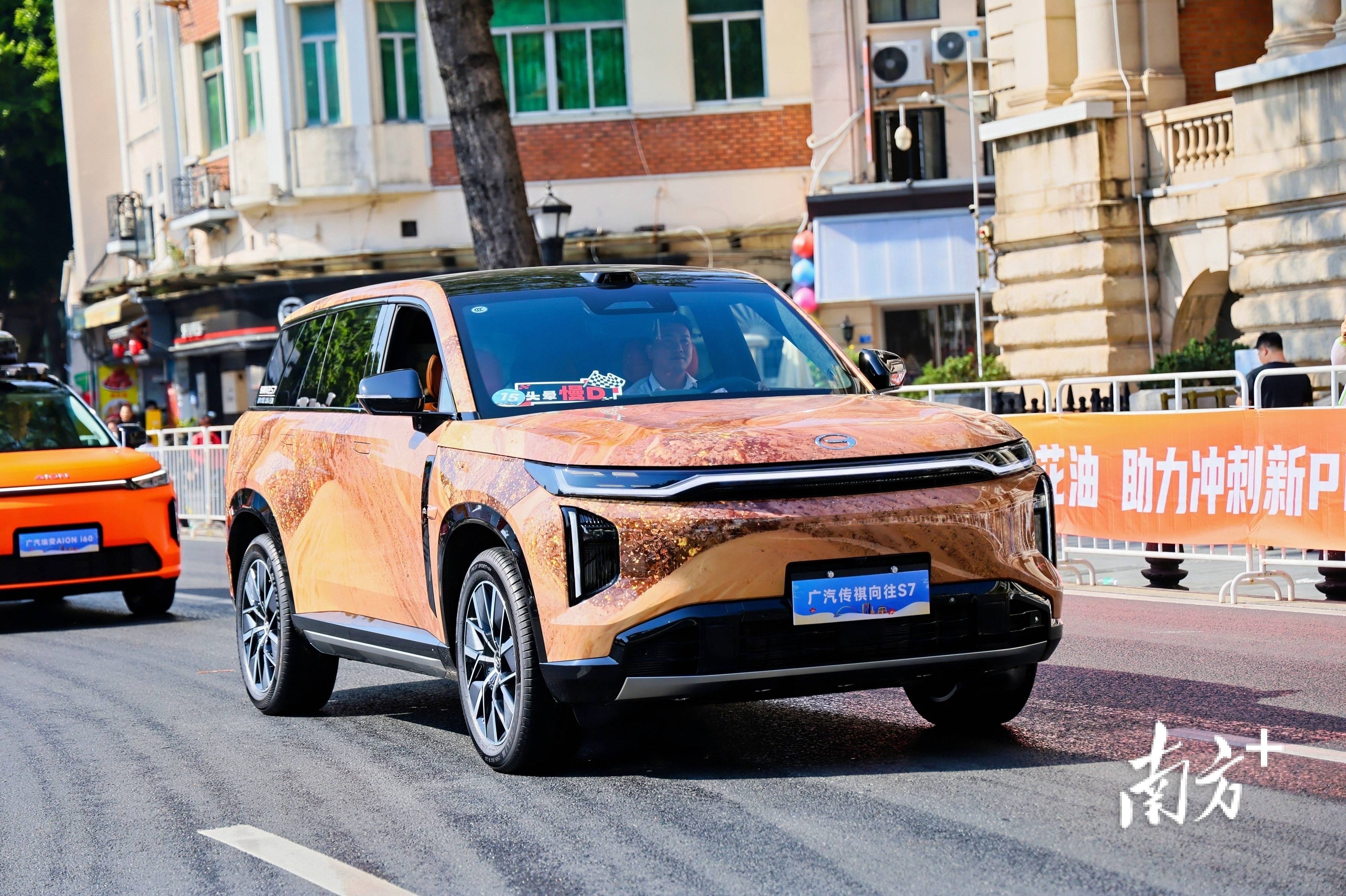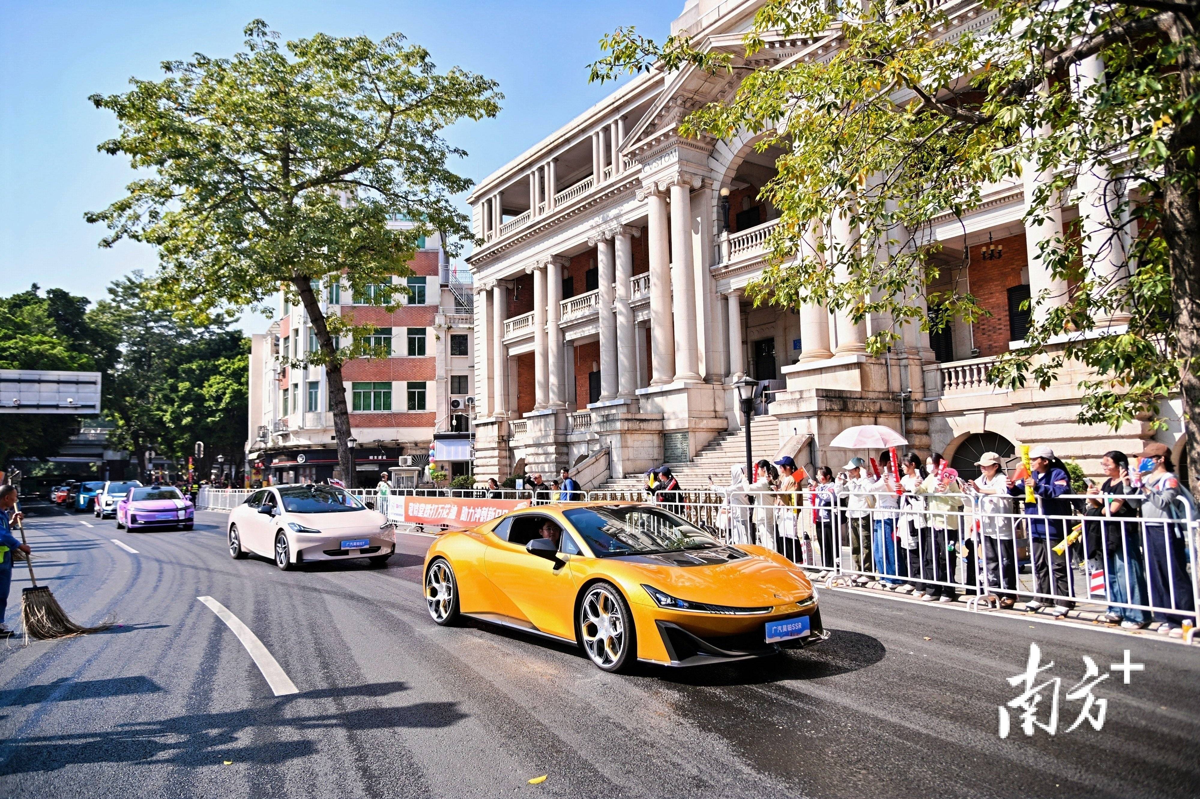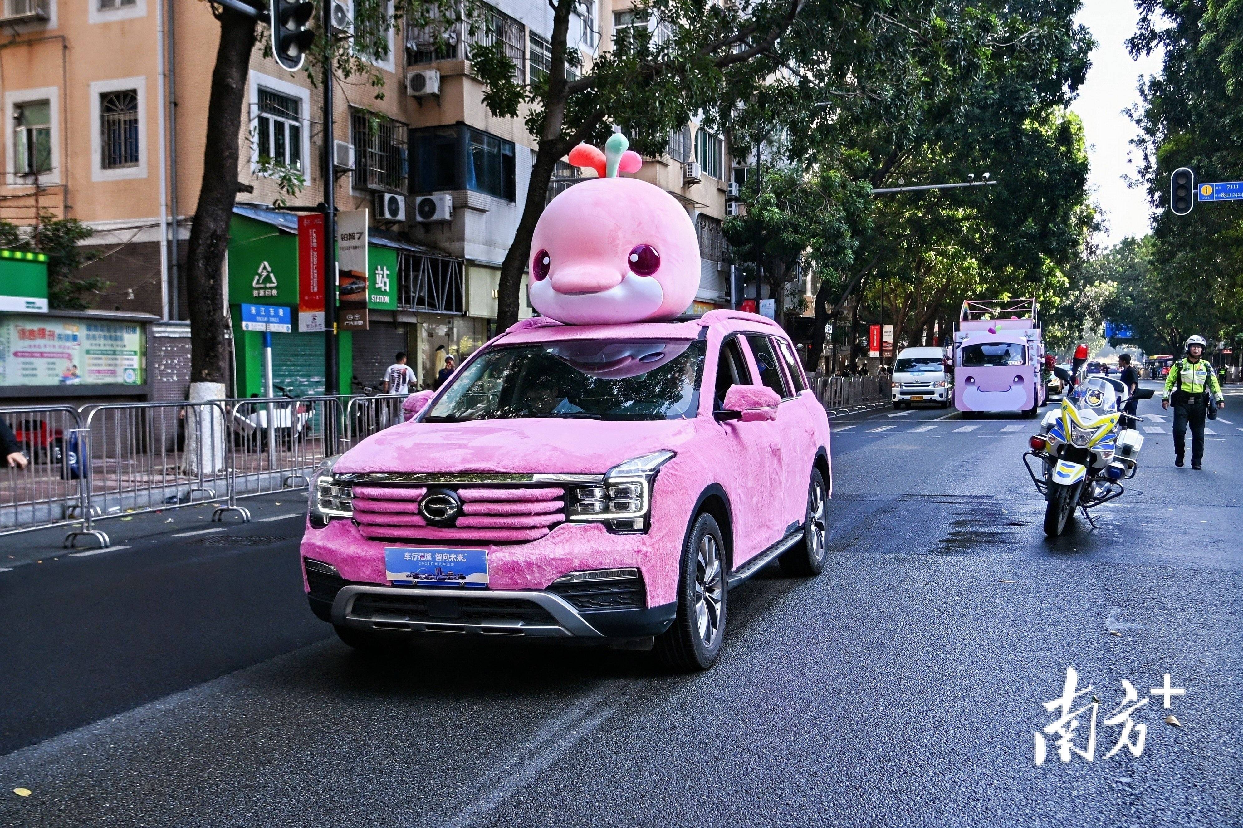 创新转型方阵,领航花车“穗悦今朝号”带着十五运的明星成员“大湾鸡”,和20台智能网联新能源车一同登场。
