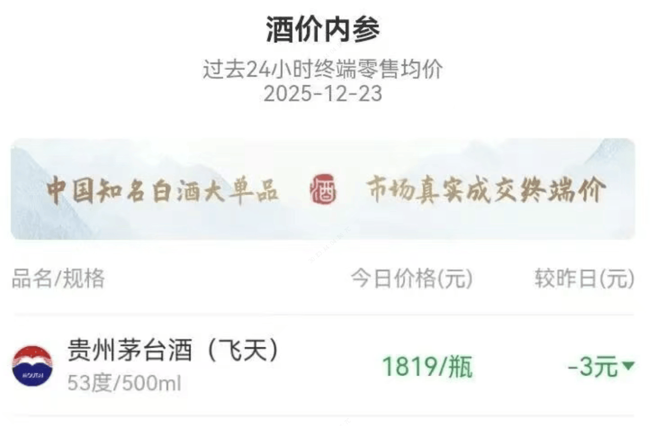从市场表现来看,飞天茅台价格回归消费本质。据新浪财经“酒价内参”整合全国近200家直营经销商、社会经销商、批发市场及零售网点的实时成交数据显示,12月23日,飞天茅台终端成交均价定格于1819元/瓶。