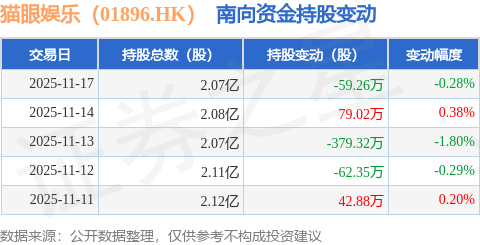证券之星消息,11月17日南向资金减持59.26万股猫眼娱乐(01896.HK)。近5个交易日中,获南向资金减持的有3天,累计净减持379.02万股。近20个交易日中,获南向资金增持的有15天,累计净增持386.68万股。截至目前,南向资金持有猫眼娱乐(01896.HK)2.07亿股,占公司已发行普通股的17.83%。