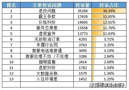 携程主要投诉问题方面,退改问题以30.39%的占比排名第一,其次是霸王条款(15.05%)、价格纠纷(12.61%)、服务态度差(11.70%)与虚假宣传(11.03%)。此外,无故取消订单、捆绑搭售、大数据杀熟排名亦靠前列,成为消费者投诉重灾区。