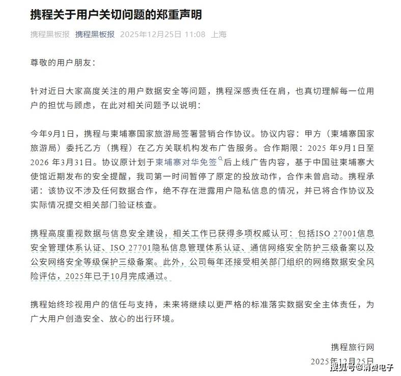 随着事件热度不断上涨,12月25日,携程发布声明回应称,协议原计划于柬埔寨对华免签后上线广告内容,基于中国驻柬埔寨大使馆近期发布的安全提醒,已第一时间暂停了原定的投放动作,合作未曾启动。同时强调“该协议不涉及任何数据合作,绝不存在泄露用户隐私信息的情况,并已将合作协议及实际情况提交相关部门验证核查。”