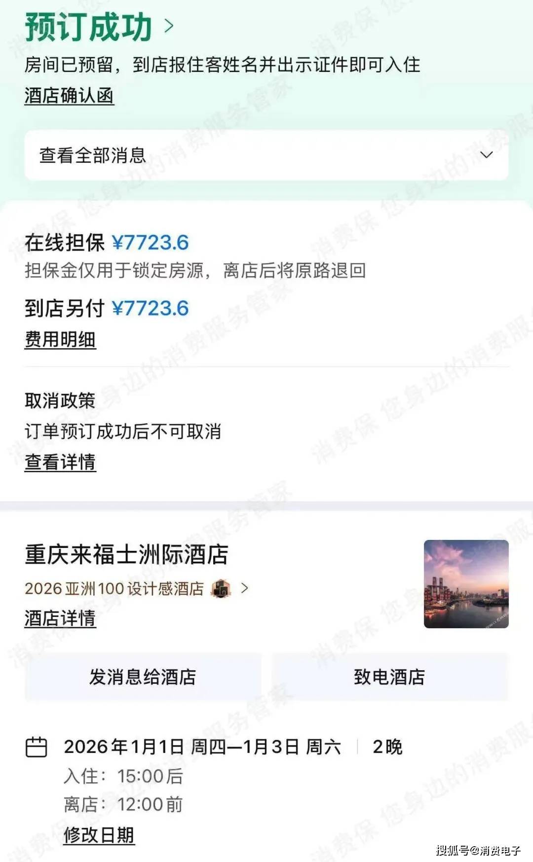 元旦假期即将到来,消费者陈先生(化名)通过携程平台预订了元旦期间入住的重庆来福士洲际酒店两间客房,共支付押金7723.6元。12月28日,陈先生因个人原因无法如期入住,于是在携程上申请退订退款。