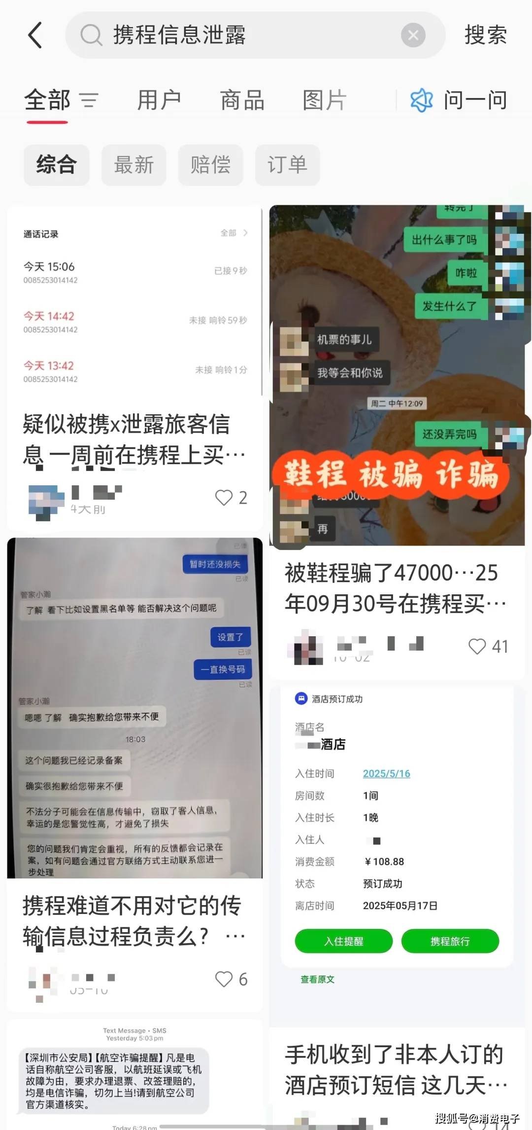 长期以来,关于携程信息泄露的疑问一直存在,在社交平台搜索关键词能够看到不少网友发帖分享自己的经历和疑惑。有网友接到诈骗电话,对方能精准报出其在携程上预订的行程信息;有网友收到与自己身份信息一致但非本人预订,且不在个人出行计划中的车票、酒店订单短信,而短信来源也是携程。