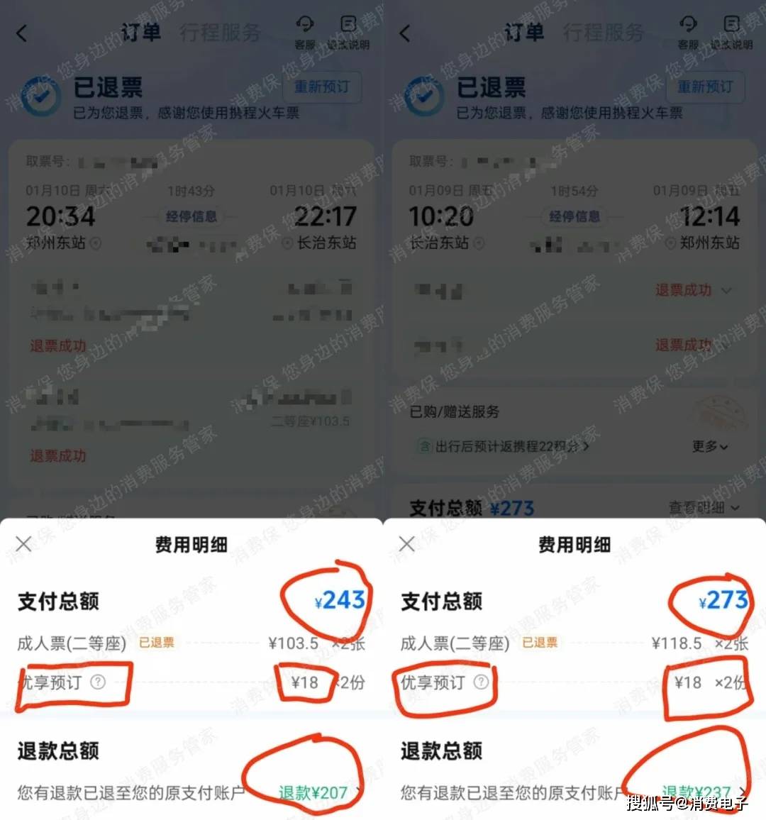 12月30日凌晨,消费者李女士(化名)在携程平台购买了4张由长治到郑州的往返高铁票。刚付完款,她就发现有些不对劲,支付的金额与票价明显不符。李女士当即选择了退款,结果退回来的钱却少了整整72元。