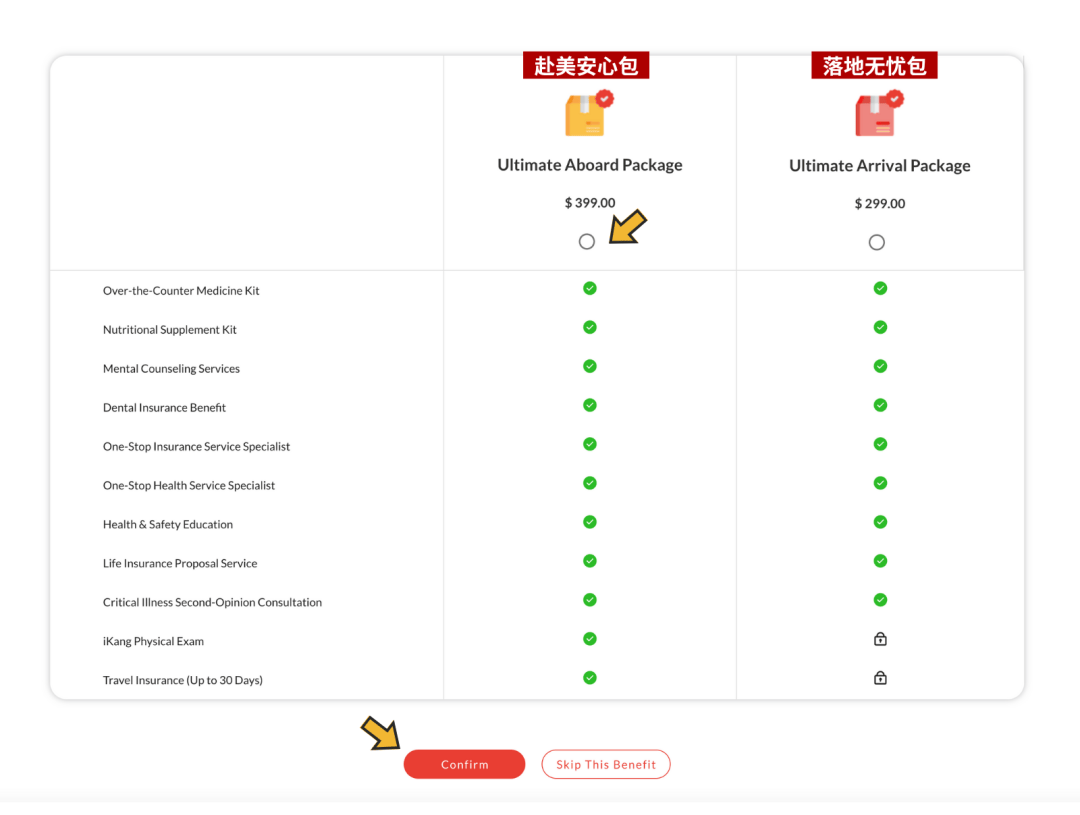 - 选择后,点击Confirm(若无需增购服务包,请点击Skip The Benefit)