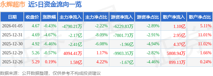 证券之星消息,截至2026年1月5日收盘,永辉超市(601933)报收于4.67元,下跌0.43%,换手率5.09%,成交量461.95万手,成交额21.57亿元。