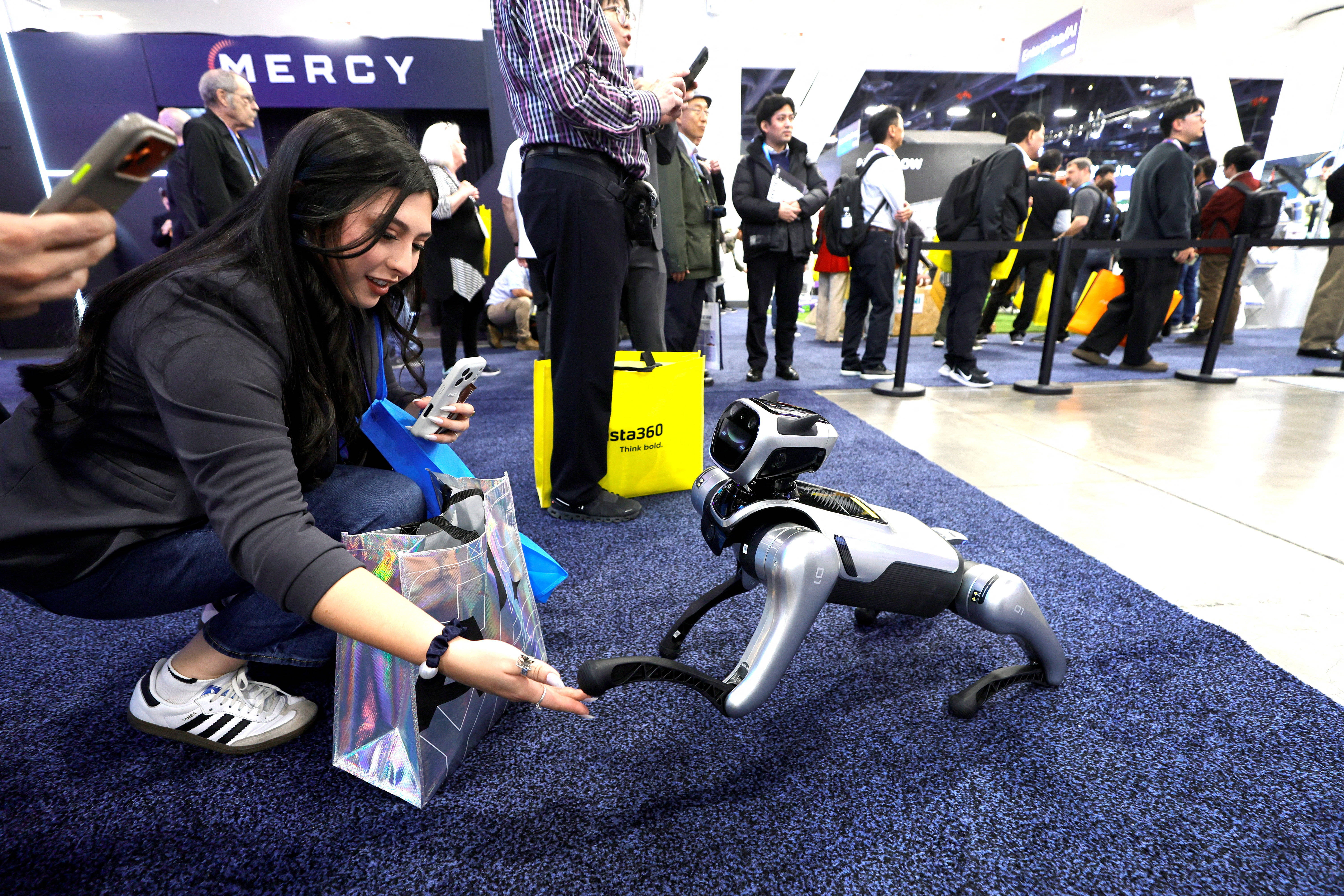 1月6日,一名女子在美国拉斯维加斯消费电子展上与机器狗互动。 新华社/路透