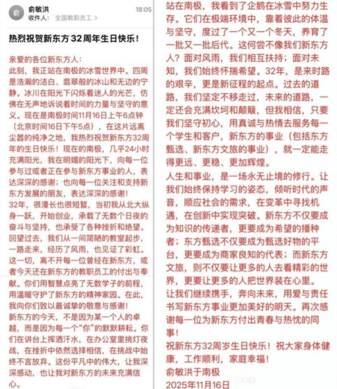 11月16日,新东方32周年成立,创始人俞敏洪在南极向全体员工发出一封全员信。内容就不写了,毕竟俞敏洪的文笔还是挺好的,基本就是告知员工自己在南极,以南极企鹅的生存精神,鼓励员工坚守初心,服务好学生与客户,展望未来事业。同时感慨了一下新东方过32岁生日了。