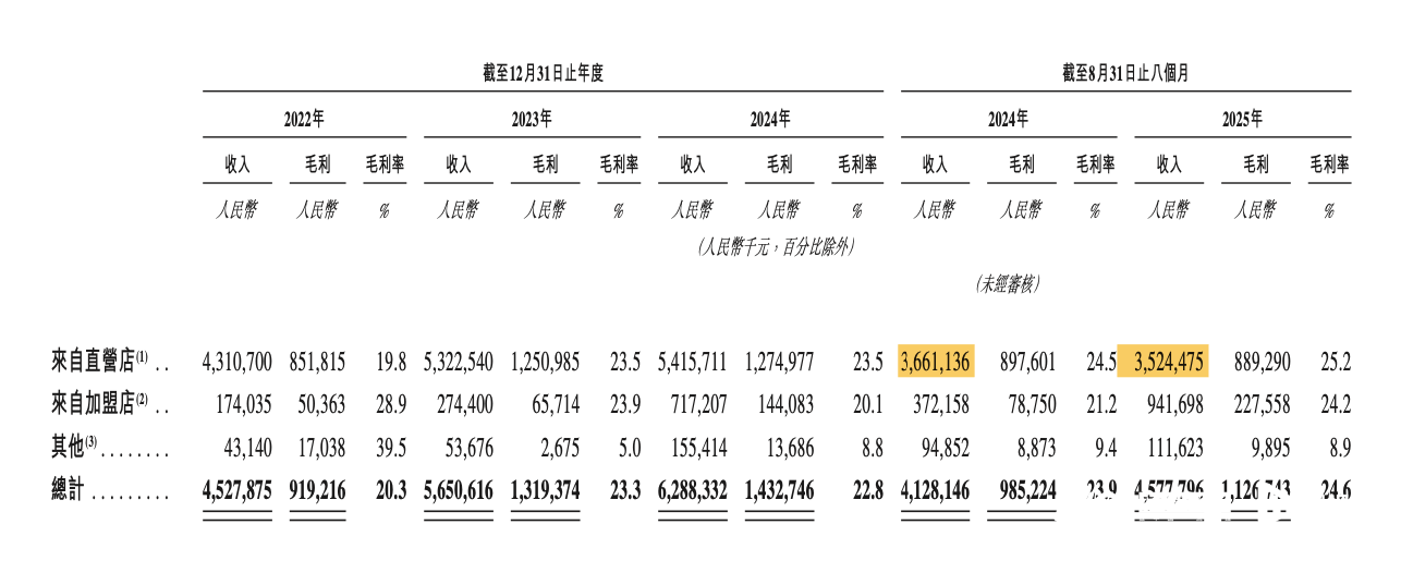 截至2025年8月31日,老乡鸡拥有1658家门店,包括925家直营店和733家加盟店。相比上一份招股书,2025年1月至4月,其直营店净减少3家,更新的招股书显示,2025年5月到8月,其直营店数量则净增加了14家。而在2022年-2024年,其直营店数量分别为1007家、973家、914家;同期,其加盟店数量分别为118家、226家、565家。可以看出,驱动老乡鸡门店数量增长的,主要是加盟店的扩张,而部分加盟店则是由直营店转换而来,2024年及2025年前8个月,其直营店转为加盟店的数量分别为146家、32家。