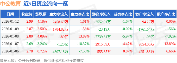 证券之星消息,截至2026年1月12日收盘,中公教育(002607)报收于2.99元,上涨4.18%,换手率10.17%,成交量517.11万手,成交额15.27亿元。