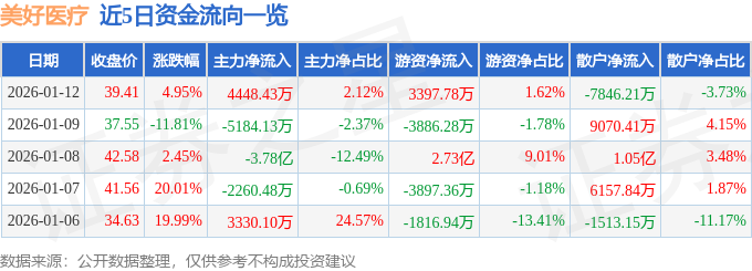 证券之星消息,截至2026年1月12日收盘,美好医疗(301363)报收于39.41元,上涨4.95%,换手率14.48%,成交量54.04万手,成交额21.03亿元。