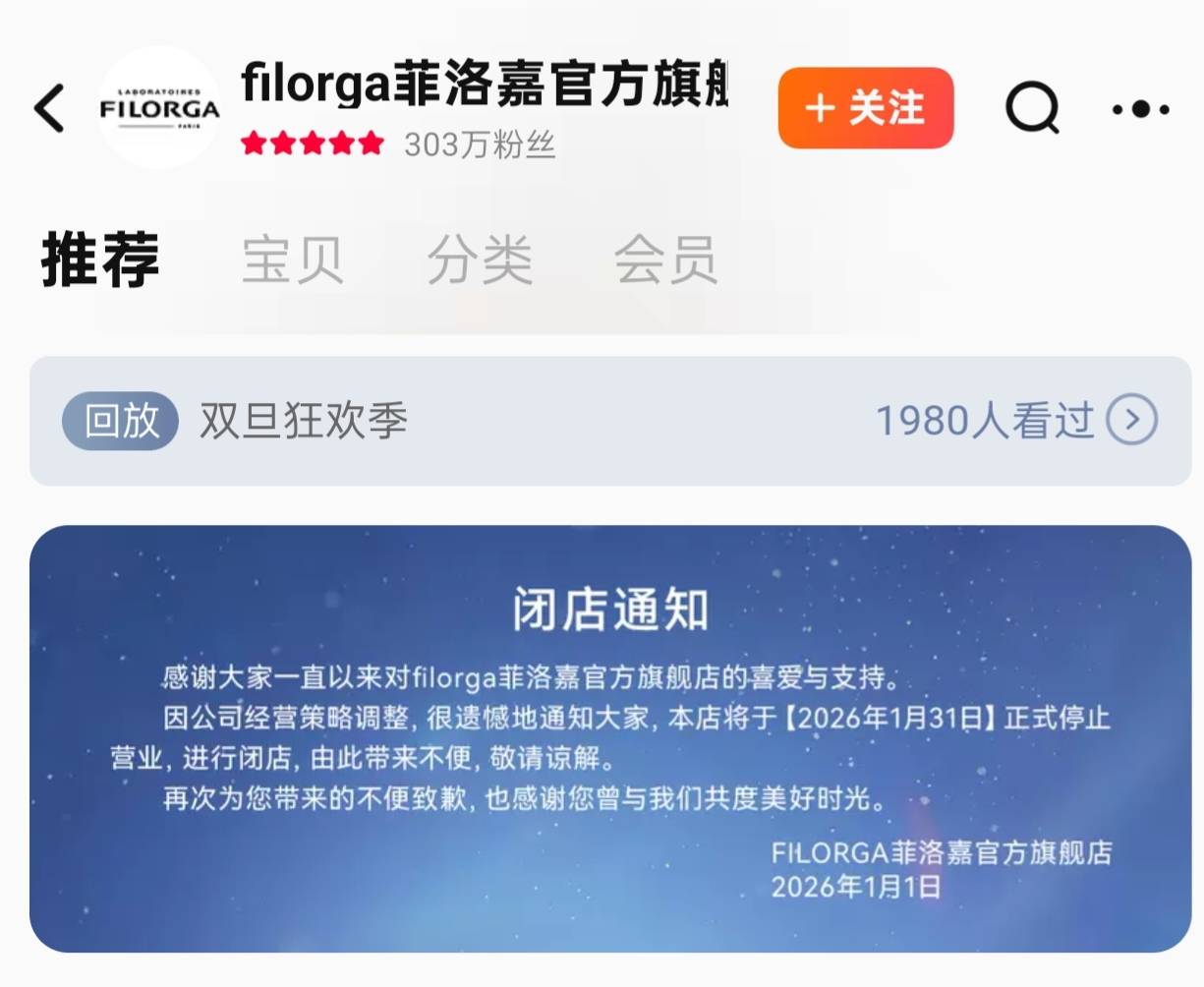 近日,青眼获悉,高露洁旗下高端护肤品牌菲洛嘉(Filorga)天猫官方旗舰店发布闭店公告,称因公司经营战略调整,将于2026年1月31日正式停止运营。