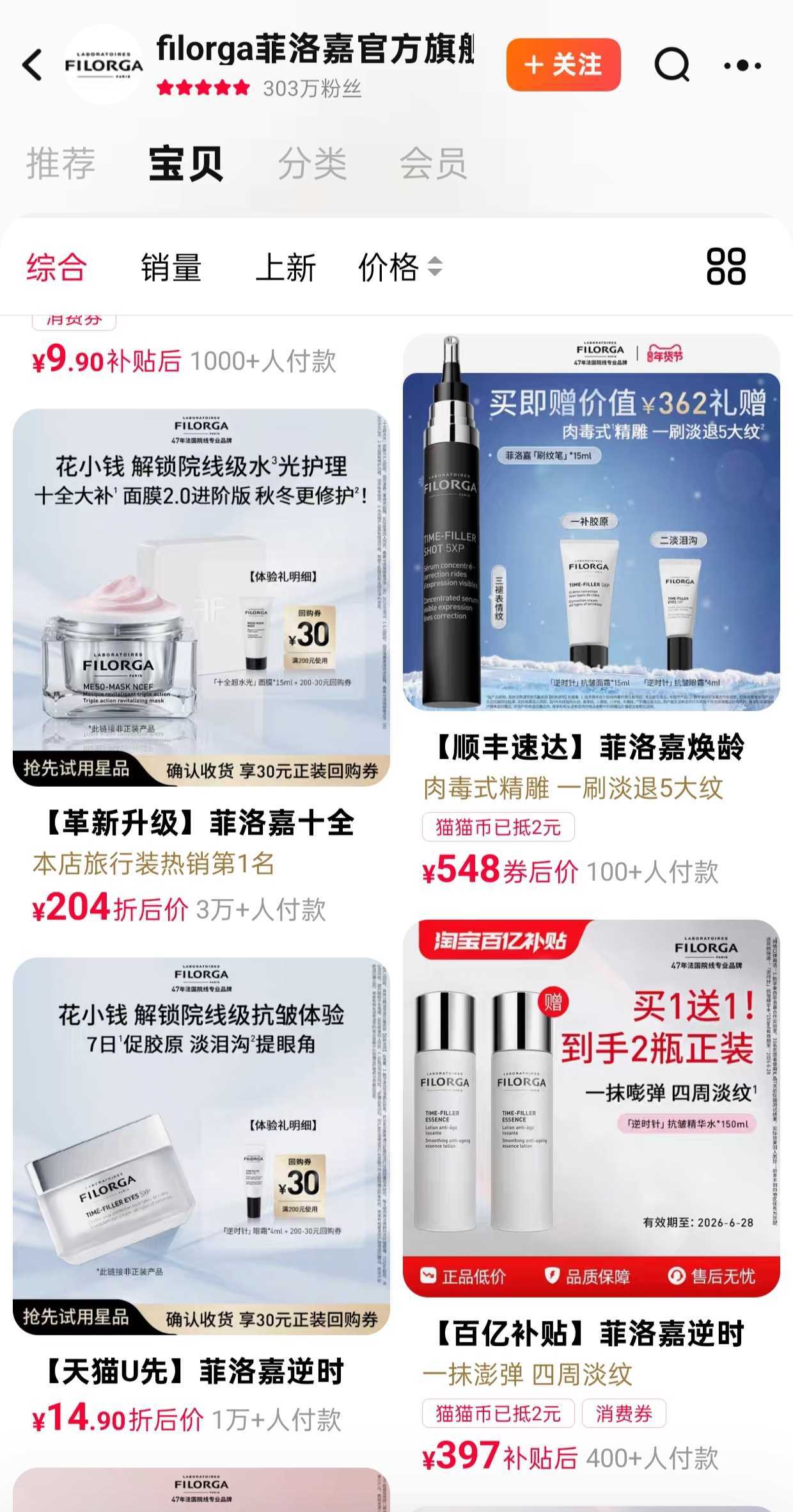 从菲洛嘉天猫官方旗舰店来看,有49款产品在售,价格大多在100-800元之间,产品涵盖面膜、眼霜、面霜等品类。其中,有7款产品累计销量破万,销量最高的是菲洛嘉“十全大补”面膜,规格15ml售价204元,已售出超3万件。