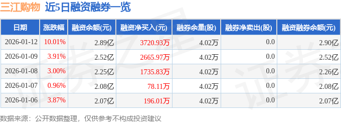 证券之星消息,截至2026年1月12日收盘,三江购物(601116)报收于17.25元,上涨10.01%,涨停,换手率12.53%,成交量68.64万手,成交额11.6亿元。