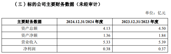 截至2023年底、2024年底,标的公司资产总额分别为4.50亿元、4.13亿元,资产净额分别为1.84亿元、1.36亿元。