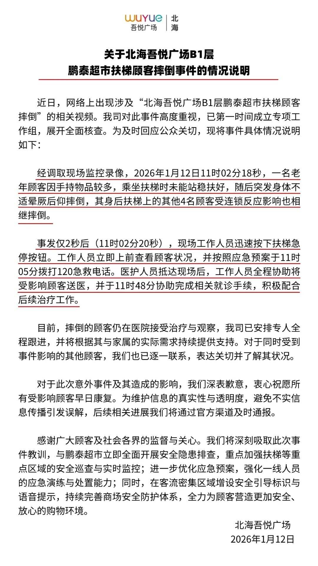 1月12日晚,广西北海吾悦广场发布情况说明:近日,网络上出现涉及“北海吾悦广场B1层鹏泰超市扶梯顾客摔倒”的相关视频。我司对此事件高度重视,已第一时间成立专项工作组,展开全面核查。为及时回应公众关切,现将事件具体情况说明如下: