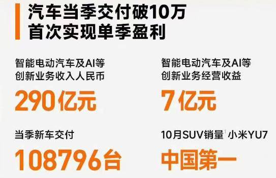 第三季度,小米汽车累计交付新车10.88万台,同环比大幅增长。得益于销售规模的提升,期内,小米集团智能电动车及AI等创新业务营收提升至290.1亿元,其中智能电动车业务实现营收283亿元,占集团总营收的25%;毛利率同比提升8.4个百分点至25.5%;单季经营收益达到7亿元,首次实现转正。