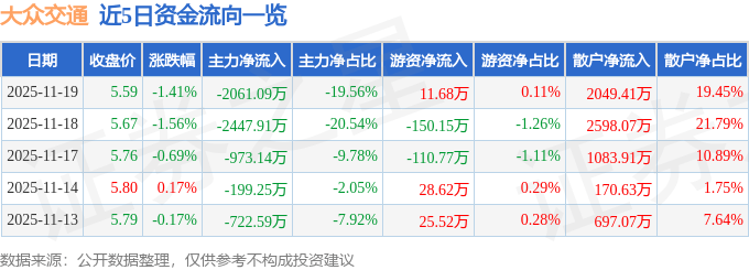 证券之星消息,截至2025年11月19日收盘,大众交通(600611)报收于5.59元,下跌1.41%,换手率1.2%,成交量18.72万手,成交额1.05亿元。