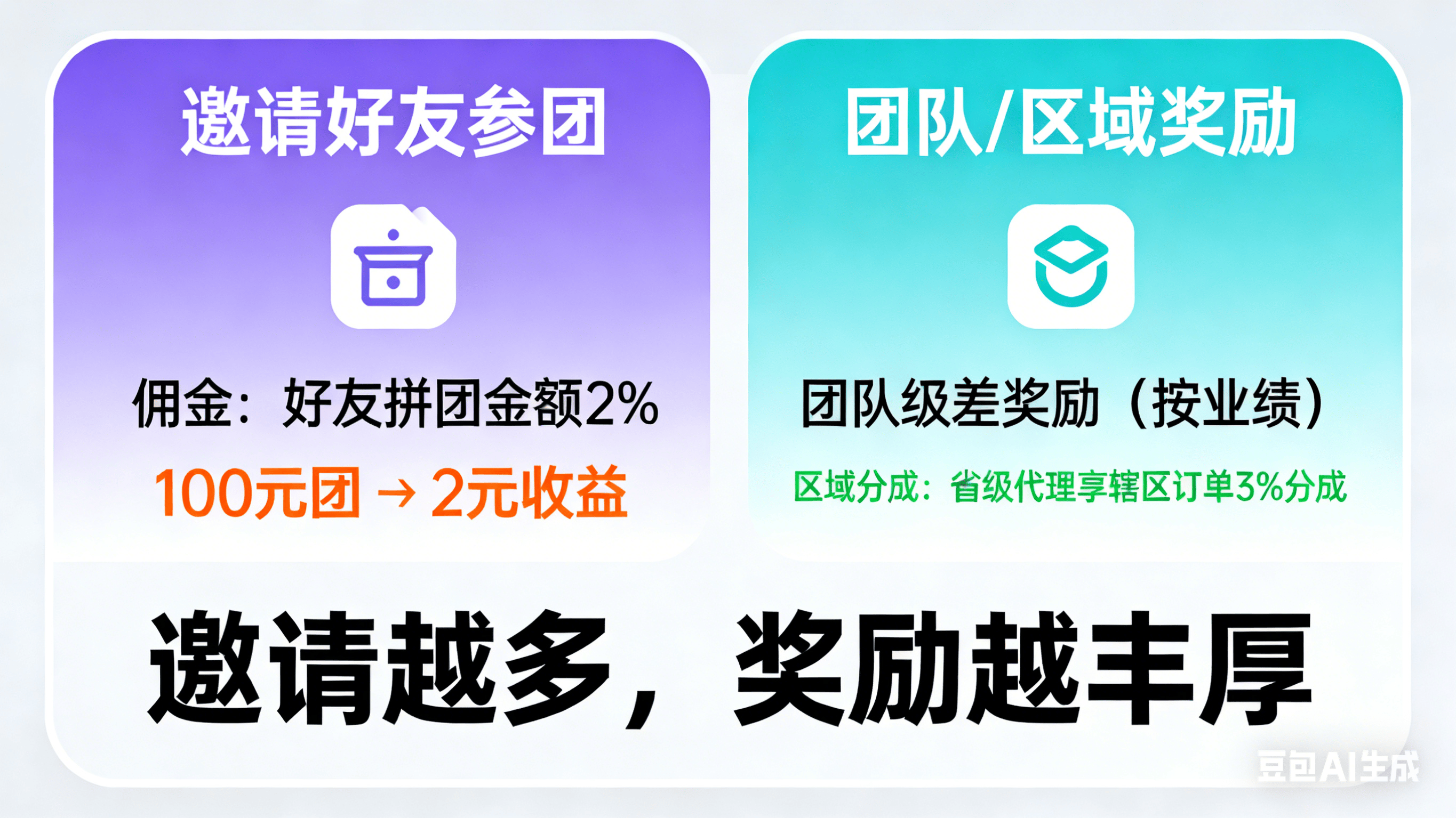 除了拼团的奖励,用户分享给朋友还能获得额外的佣金,这是平台实现社交裂变增长的关键。在合规的前提下(一般不超过 2 级分销),规则如下: