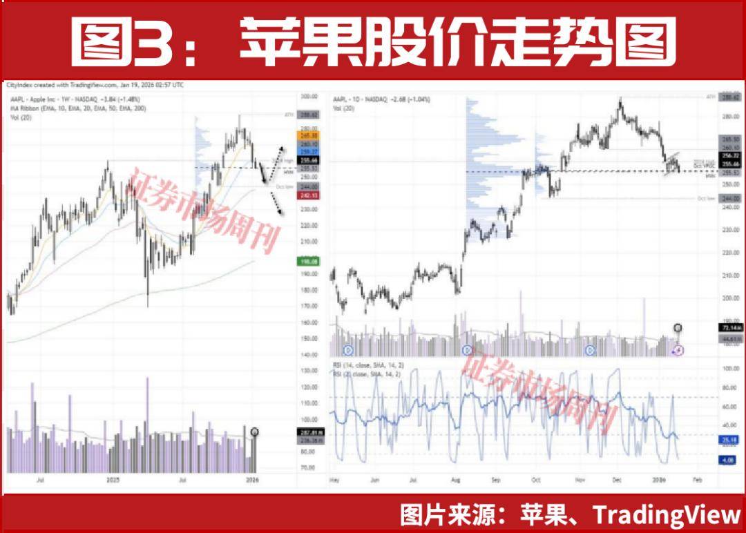 周线图显示苹果股价于2025年12月在290美元以下录得流星线。虽然当周成交量低于平均水平,但随后的抛售更利落,跌幅达11.7%的下跌期间出现了三根高成交量的看跌K线。