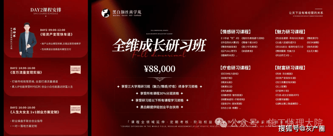 据黑白颠公众号介绍,黑白颠有三大商学苑:魅力商学苑、情感商学苑、疗愈商学苑。其中,魅力商学苑的课程包括性魅力体系、性技巧体系等,如丝袜诱惑、浴室玩法、狐系媚术、道家媚术之无极欢愉;情感商学苑侧重于亲密关系、家庭教育等方向;疗愈商学苑则设有艺术疗愈、性疗愈课程、BDSM课程等,课程介绍中写着:“关于性的一切问题,这里你都可以找答案。”