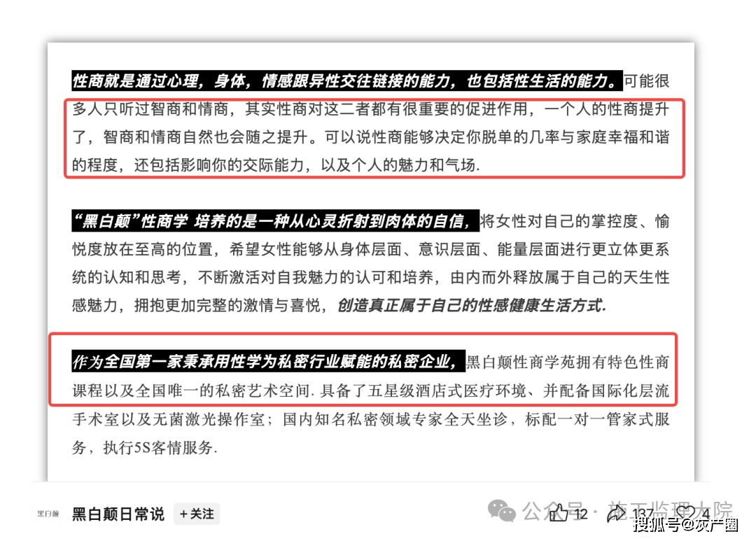 “情商”“美商”等概念已为大众所熟悉,那么“性商”又指什么?据“黑白颠”官方公众号介绍,该学苑始于2018年,定位为国内第一家女性“性商教育平台”,旨在培养“从心灵折射到肉体的自信”。介绍详情提到:“一个人的性商提升了,智商和情商自然也会随之提升。”“性商能够决定你脱单的几率与家庭幸福和谐的程度,还包括影响你的交际能力,以及个人的魅力和气场。”