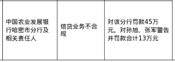 罚单显示,中国农业发展银行哈密市分行的主要违法违规事实为:信贷业务不合规。
