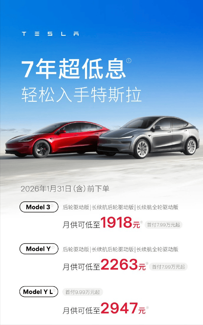 这一轮风暴的始作俑者依然是特斯拉。1月初,特斯拉中国突然宣布针对Model 3和Model Y推出“5年0息”及“7年超低息”方案,将分期年限史无前例地拉长至84期。这一举措瞬间击穿了行业的心理防线,迫使所有还在观望的玩家被迫入局。