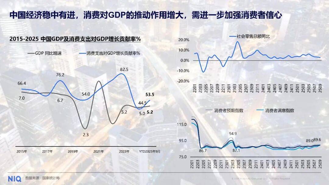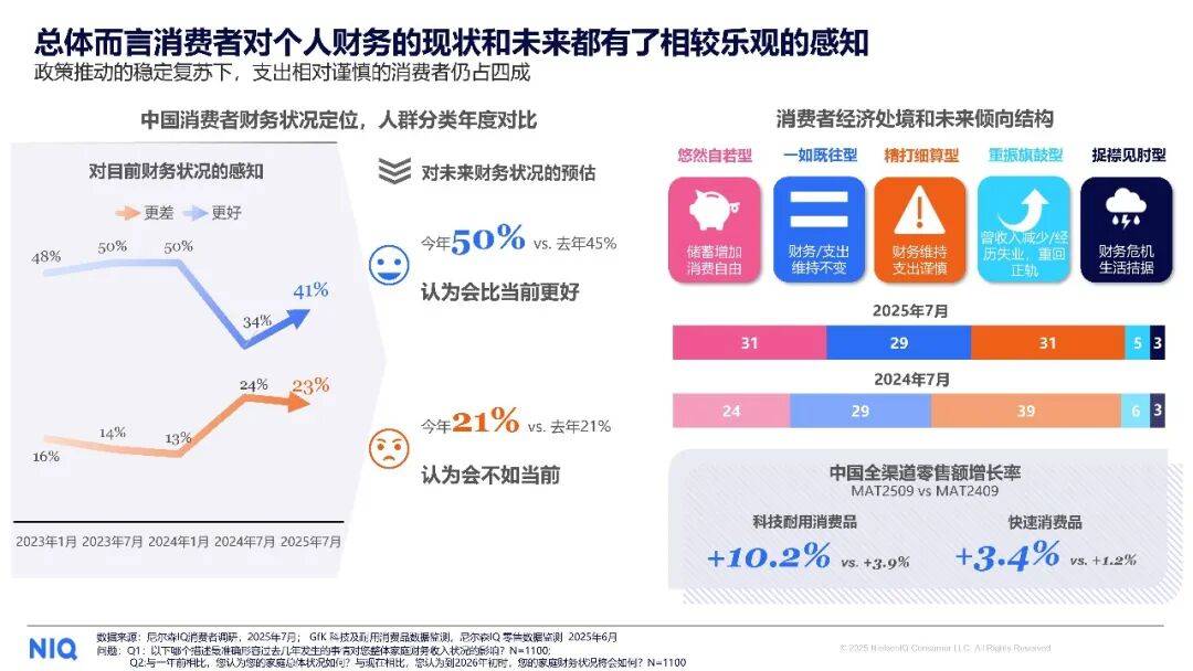 中国经济稳中有进,消费对GDP的推动作用增大,但需进一步增强消费者信心。2025年,政府通过多轮国债补贴刺激消费,合计近3700亿元,推动消费品以旧换新等项目。消费者对个人财务现状和未来预期较为乐观,但仍有四成消费者支出相对谨慎。