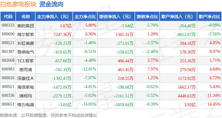 从资金流向上来看,当日白色家电板块主力资金净流出2.12亿元,游资资金净流出1.78亿元,散户资金净流入3.91亿元。白色家电板块个股资金流向见下表: