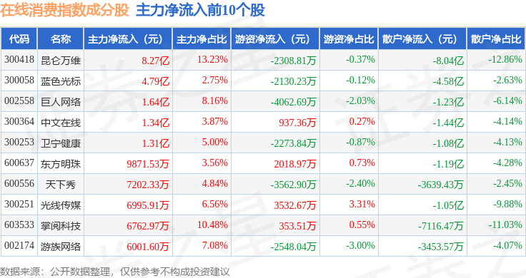资金流向方面,在线消费(399361)指数成份股当日主力资金净流入合计14.3亿元,游资资金净流入合计1898.74万元,散户资金净流出合计14.49亿元。成份股资金流向详情见下表: