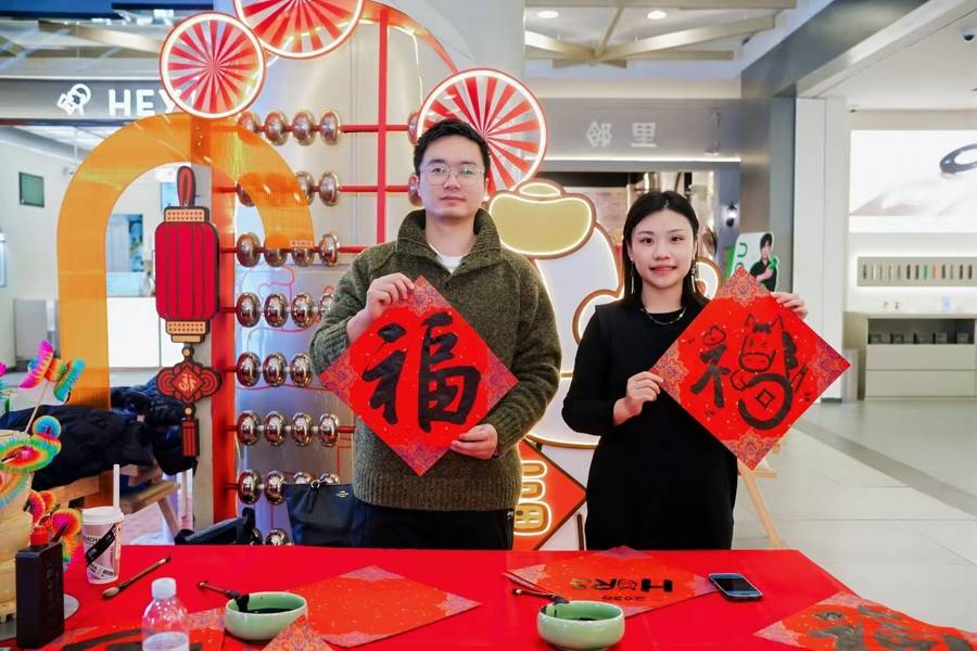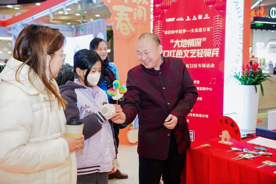 走进百联曲阳购物中心,来自虹口区文化馆的书画干部正在挥毫泼墨,向过往市民群众赠送“福字”,其中长着马头的版本格外受欢迎。虹口区非遗项目翻花传承人则向大家展示“成语翻花”,上下抖落即可做出“三阳开泰”“锦上添花”等不同造型,用老传统玩出新花样。