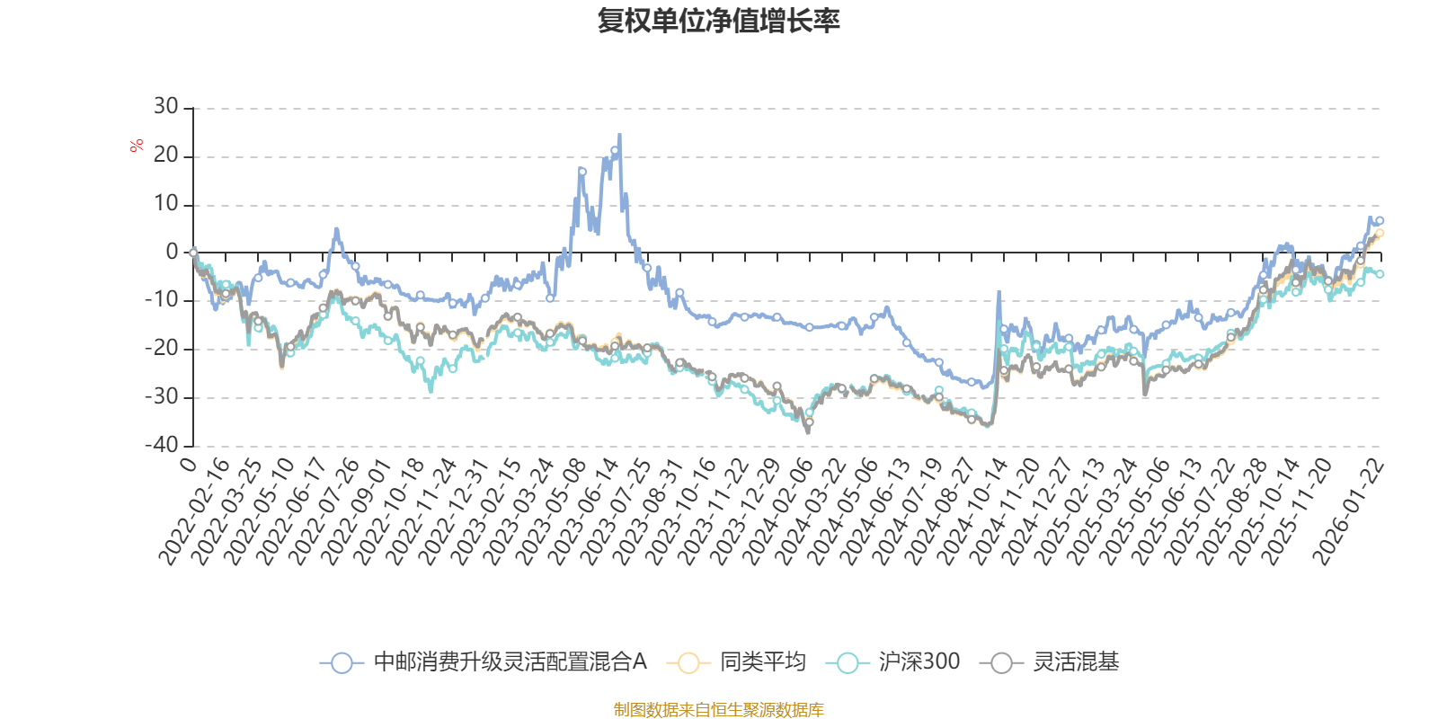 截至1月22日,中邮消费升级灵活配置混合A近三个月复权单位净值增长率为10.04%,位于同类可比基金570/1286;近半年复权单位净值增长率为21.71%,位于同类可比基金643/1286;近一年复权单位净值增长率为29.20%,位于同类可比基金714/1286;近三年复权单位净值增长率为13.17%,位于同类可比基金715/1286。