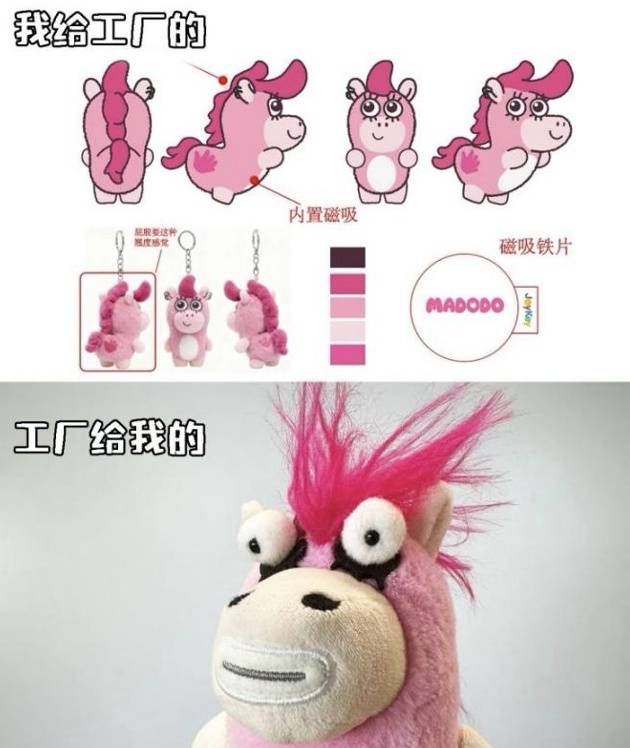 设计师KK见证了这股潮流的热度。为了迎接马年,她最初设计了一款可爱风的小马IP。今年六七月份完成设计,十一月左右推进产品落地。“和厂家对接的过程其实挺头痛的,没想到最终成品和设计稿偏差很大,算是给了我们一个‘惊吓’,但细品之下又有点惊喜。”KK觉得这个“跑偏”的形象很有意思,便随手分享了出去。