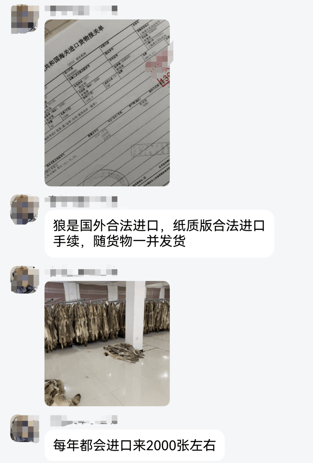 在商品页面,有网友询问,“是不是中国狼皮非法捕猎的”,商家回复称,“都是国外养殖的,合法进口来到国内,合法手续纸质版的一并发货。”有网友询问,“是不是真狼皮”,商家回复称,“保真,北美大草原的狼,在加拿大皮草拍卖行拍卖到手,发给柬埔寨专业的厂家进行鞣制加工,然后开始运往咱们国家缴纳各种通关税费。”